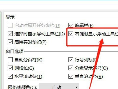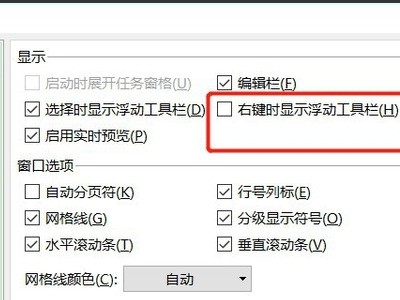 5、在视图的显示里面,有一个【右键时显示浮动工具栏】的勾选项,勾选项默认是勾选的。