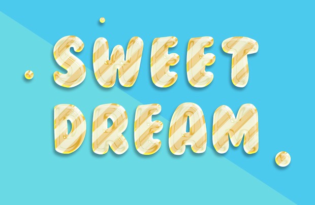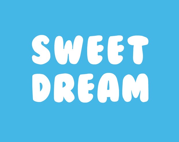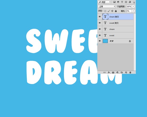 可以将背景填充蓝色背景。其实背景色只是为了接下来创建文字的需要。这时,可以在画布中央用BubbleGum字体写上你的文字,例如我在这里写的“sweet dream”,当然这是为了应景。