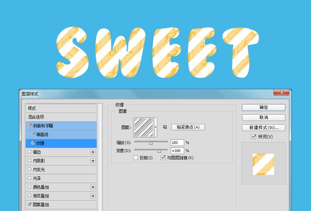 还记得我们的复制层吗?填充虽然被降低为0,但给它添加图层样式依然有效。这时,我们打开“sweet”的复制层的图层样式中的“斜面与浮雕”,为文字添加高光。而与此同时等高线变为弧形,增添了文字表面高光的圆润感。