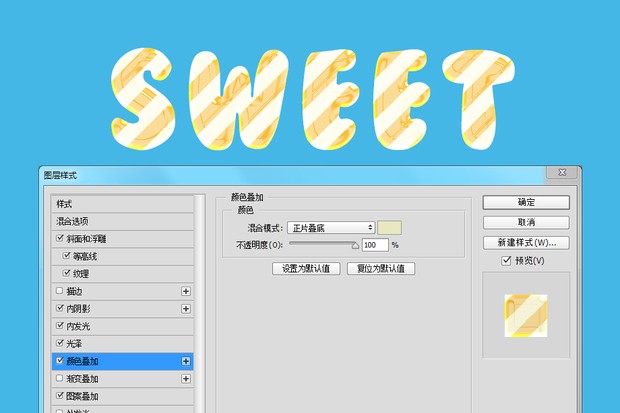 由于在这里,我们看到文字经过几次高光的影响纹理的细节不够清晰,这时,我们就需要让细节更凸出,做法就是应用上“颜色叠加”,叠加的混合模式变为“正片叠底”,目的是为了让细节凸显出来,但又不至于太过暗淡。