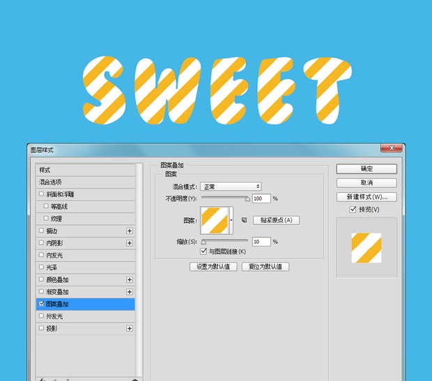 给图层应用图案叠加。对了,就是让我们的白色文字铺上斜纹图案。这一步比较简单。大家可以看到我把缩放调整到10%,这意味着这一功能可以缩放图案的大小。
