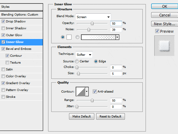 这时,我们想要让高光区域也同样变得更有透明感,光线更强一些。那么我们就要拿出“内发光”的样式。通常,内阴影和内发光是结合一起使用的。内发光的参数面板让我们先将混合模式设置为“线性减淡”,颜色可以运用深棕色的渐变色系。颜色的选择是配合了我们的图案的色系。