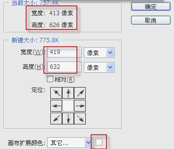 3.执行“图像——画布大小”。弹出“画布大小”对话框,为了拼版后裁剪方便,所以我们在人像的上迅些太构具倒下左右各多出3个像素的白边,方便裁剪。原始宽度是413像素,左右各增加3个像素,也就是419像素,同样高度也是上下各增加3个像素,为632像素。画布扩展颜色,就是多出来的白边,我们选择白色。单击确定。