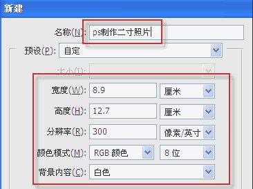 名称:ps制作二寸照片,宽度:8.9厘米,高度:12.7厘米,分辨率300,颜色模式:RGB。