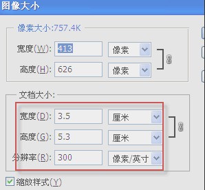 裁剪后的尺寸,我们可以单击“图像——图像大小”命令来检验裁剪的是否是二寸照片的大小。我们在文档大小里面可以看到高宽分辨率都是符合二寸照片尺寸的。这样,一个单张的二寸照片仍二露击知径胜联孩海就做好了。