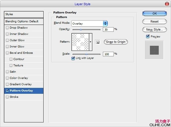 激活图案叠加,然后在对话框里将混合模式切换到叠加,不透明度设为30%,图案选择刚刚建立的(如下图).