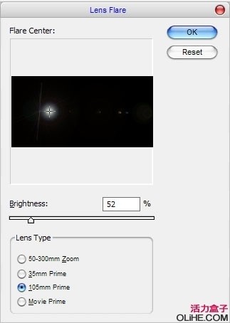 现在可以开始了,滤镜>渲染>镜头光晕.应用下图的设置.