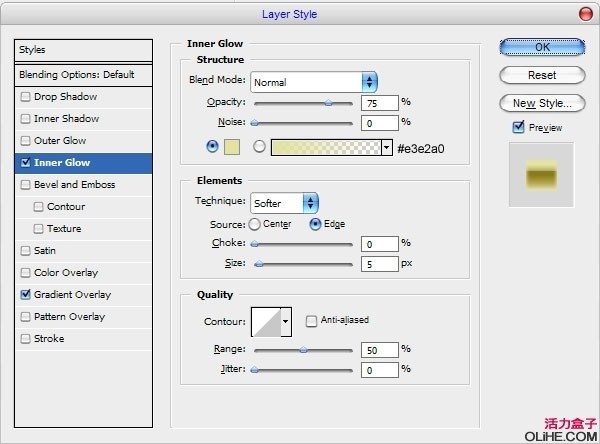 然后给打开新图层的混合选项,激活内发光和渐变叠加选项,设置如下图.
