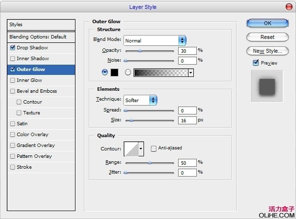 我们打开它的混合选项对话框,激活投影和外发光,如下图设置.