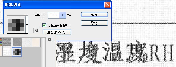 这幅图是用针式打印机打出来的,(有打印机的针触点纹)并且是灰背景。根椐这幅图,下面做两个准备工作,定义背景图案和笔划图案。放大图片找到有代表性的背景部位,用矩形套索加入选区,