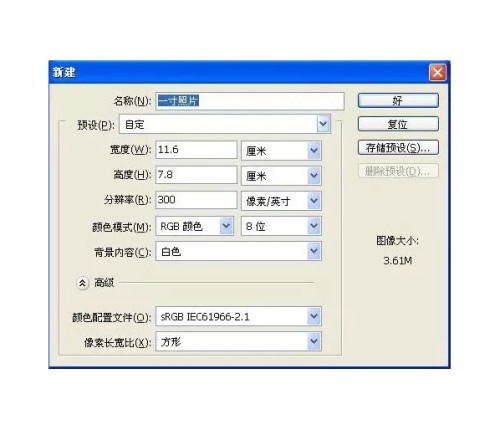 5、新建一个画布:点文件--新建(调宽度:11.6厘米,高度:7.8厘米,分辨率300像素/英寸)(如下图)