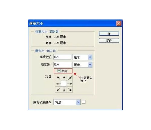 3、点图像一画布大小:(调宽:0.4厘米,高:0.4厘米)点确定(如下图)