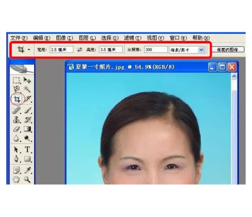 2、在工具栏,点裁剪工具(调宽度:2.5厘米,高度:3.5厘米,分辨率:300像素),在照片上选取合适的位置,点属性栏(如下图)