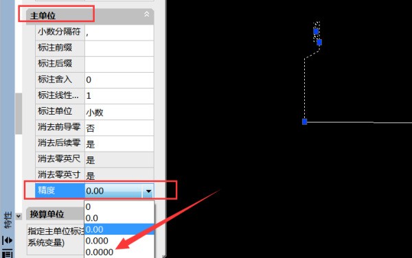 4、在特性窗口中下拉找到【主单位】,在下面的列表最后一栏有【精度】字样,在里面选择【0.000】,然后回到绘图界面就可以看到标注已经显示为四位小数。
