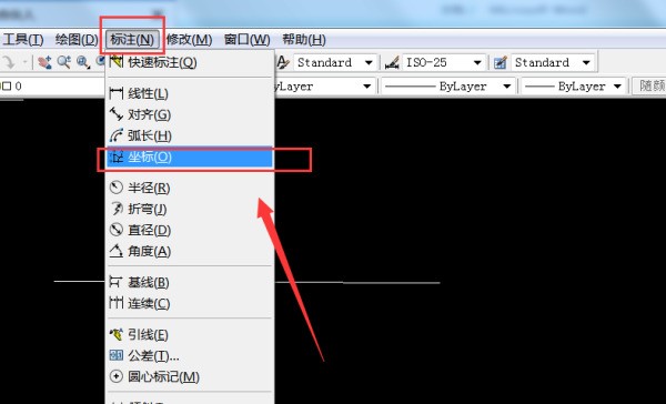 1、同样是在cad中绘制一条直线,然后在工具栏找到【标注】选择下面的【坐标】