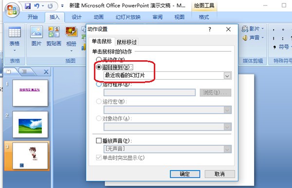 6、按住鼠标左键不放,慢慢移动,然后松手,这时就形成了一个动作按钮,同时也会弹出一个对话框,在对话框中我们选择“超链接到”,接着在下面的框中选择“最近观看的幻灯片”。最后点击“确认”。