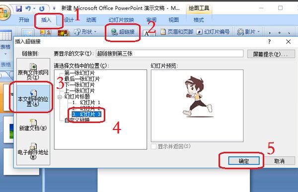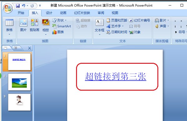 3、选中文字之后,点击“插入戚困”,再点击“超链接”。这时会弹出一个对话框,在对话框中选择“文本档中的位置”,然后就可以选择“幻灯片3”,最后点击确认。