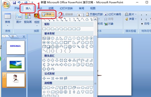 5、先选择第三张幻灯片,然后点击“插入”,再点击“形状”,会弹出一个下拉框,在下拉框中的最低端,我们会看到“动作按钮”,我们选散答择第一个表示返回的360问答按钮。