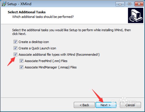 在弹出的“选择额外任务窗口”中,勾选“A丰英ssociate additional file type with XMind(Recommended!)”选项,然后点击“Next按钮”进入下一步;