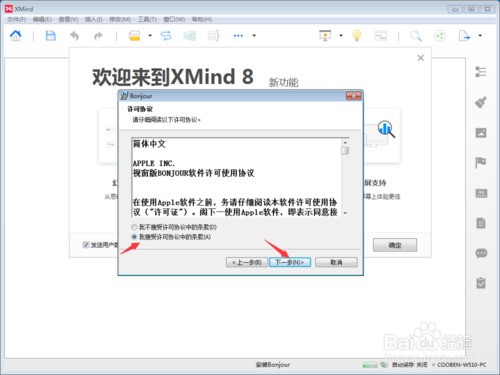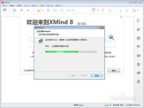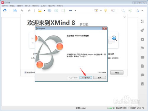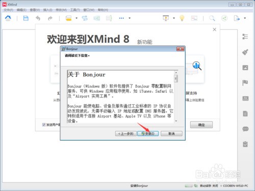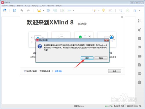在初次启动XMind 8时,它会弹出“是否安装Bonjour软件的对话框”(用于局域网共享XMind文件),点击其中的“确定按钮”确定安装;