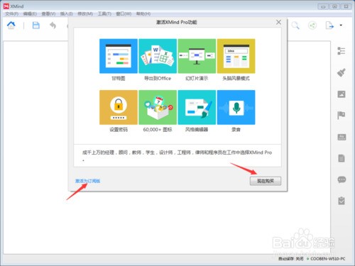 在XMind主界面中,点击菜单栏中的“帮助->序列号菜单项”,打开”激活XMind Pro功能对话框”,点击其中的“现在购买按钮”可以购买Pro版,点击“激活为订阅版”,会弹出注册用户登录框,输入Pro版用登录信息,即可让XMind变成Pro版;