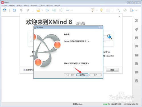 等待Bonjour安装完毕后,会弹出“完成窗口”,点司调精杂甚纪击窗口中的“结束按钮”结束安装;
