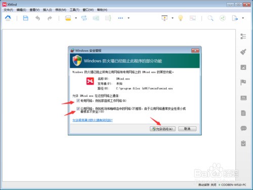 XMind重启之后,Windows防火墙会弹出“Windows安全警报”,勾选其中的“专用网络”和“公用网络”,然后点击“允许访问按钮”,允许XMind通过防火墙;