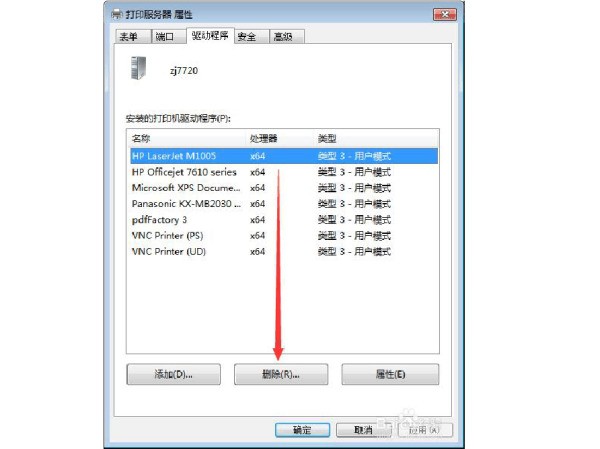 6. 6选中刚删掉的打印机的驱动,并点击删除按钮。