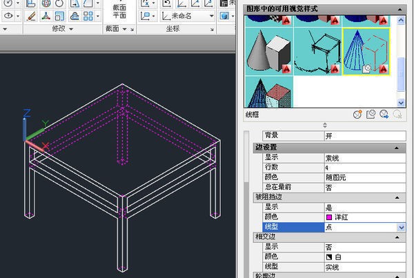 点击视觉样式控件/视觉样式管理器(或者直接输入vis命令),在出现的视觉样式管理器中,点选“线框”(倒数第二个),然后将被阻挡边下的颜色和线型分别改为洋红和点,得到如下图