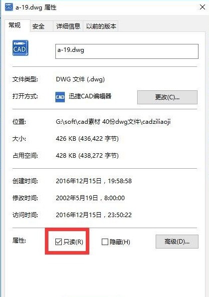 找到要修改属性的文件所在的文件夹,鼠标左键单击选定要修改的文件,再按鼠标右键弹出菜单栏,鼠标单击选择最后一个选项“属性”,在弹出的属性对话框里,把只读前面的勾√去掉,确定,再打开修改的CAD文件即可。