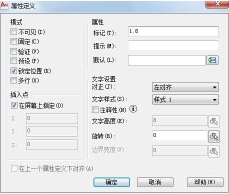 画出后,点击插入→定义属性;弹出属性定义对话框;