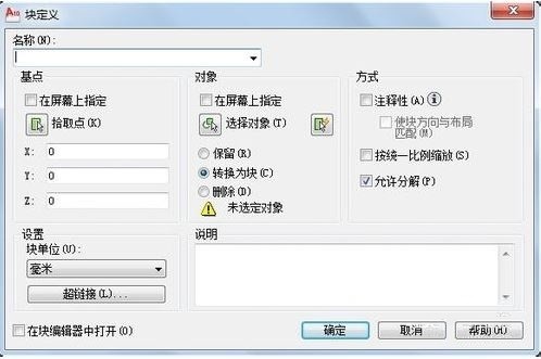 接下来创建块;插入→创建;弹出块定义对话框;
