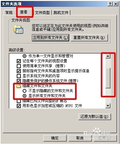 3、第二步,进查看菜单,往下拖动滚动条,找到显示所有文件和文件夹,点勾这一项,点确定,如图