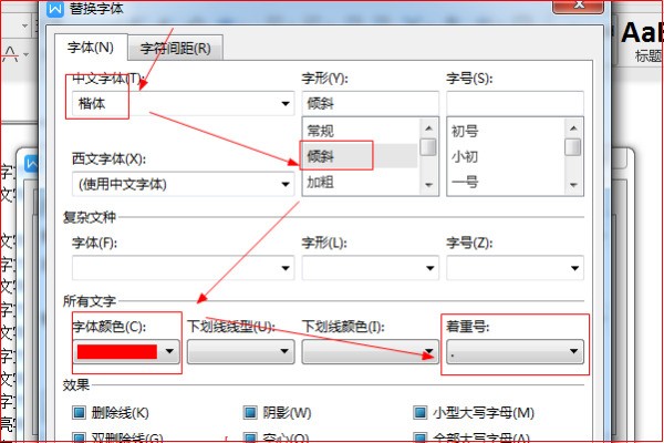 6、在弹出的“替换字体”对话框中,“中文字体”选择“楷体”,“字形”选择“倾斜”,“字体颜色”选择“红色”,“着重号”处选择“.”号,最后点击“确定”。