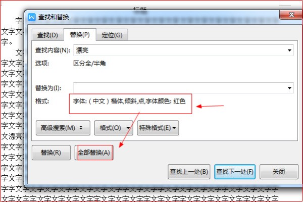 8、如图所示,正文中“漂亮”一词都被替换成了需要的格式。在word中这样就成功实现将正文所有的某一个词设置为楷体、倾斜、红色、加着重号的目的。