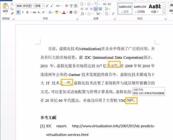 5.在添加交叉引用后,将鼠标放在正文的“[1]”上停留时,就可看到下图的效果(浮出“按住ctrl并单击可访问链接”);用鼠标选中“[1]”,点击下图中圈出的格式,将编号放在右上角,效果如下图。