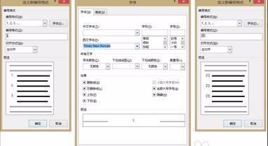 2.将鼠标放在第一条参考文献最前面,并点击编号,选择“定义新编号格式”,在弹出的对话框中,点击“字体”,看到图中间的界面,设置字体后,点击确定后如图,编辑“编号格式”,即在数字左右添加中英文的括号。