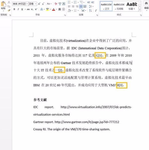 1.打开Word文档如下图所示,在正文中有三处(黄色圈出)需要添加对参考文献的交叉引用,分别为参考文献中的三条。