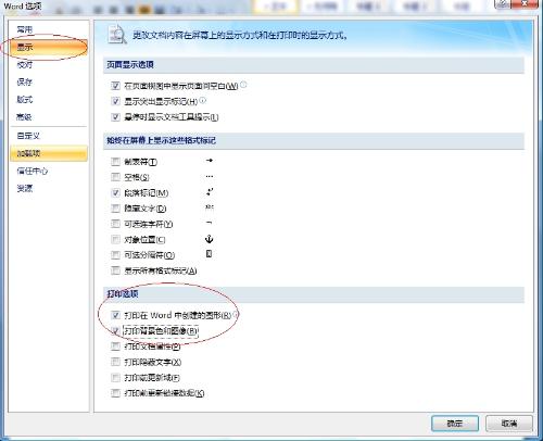 在弹出的对话框中选择"显示"选项卡,在右侧窗口中找到"打印选项",并勾选"打印背景色和图像":