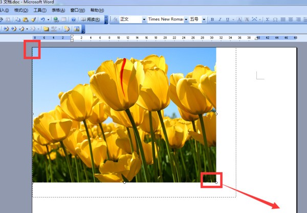 4、修改了图片的版式之后,直接拖动图片到左上方顶角重叠,根据实际情况,按住键盘上的shift键,拖住图片右下角向内等比缩小或者向外等比放大;