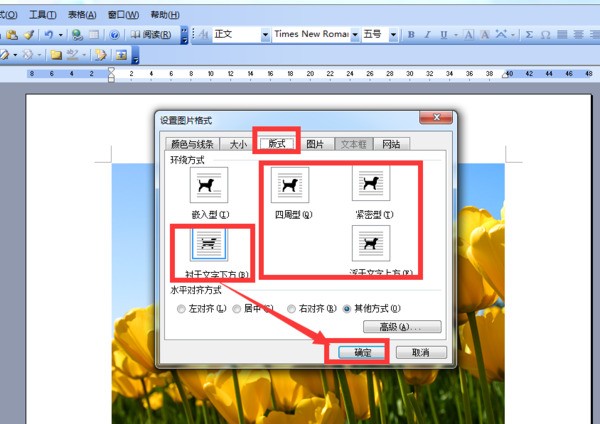 3、插入图片之后,双击图片,在“设置图片格式”界面上,点击“版式”,任意选择一种非嵌入型的环绕方式,比如“衬于文字下方”,点击“确定”;