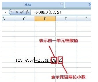 2.然后在其旁边任意单元格输入“=round()”,把光标定位来自到括号内,再点击数字单元格,之后再键入2。