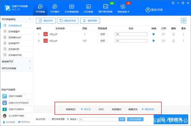 在pdf转w车接养看ord的功能界面内,我们将需要的文件上传成功后,有些设置需要大家修改,如页面下方的转换格式或转换模式,可以选择需要的一点。
