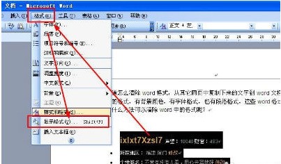 4、以上前面三种清除格式方法能做到完全去除格式而不能修改一部分格式,那要清除一部分word格式的方法如下,首先选中需要修改格式的文字,然后点击选择格式菜单下的显示格式。