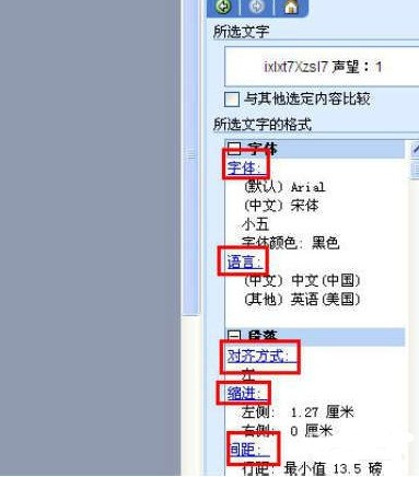 5、这样就会在word文档右侧显示选中的这段文字的所以格式了,包含字体、段落、节等格式,如果觉得哪个格式不对,就可以鼠标点击蓝色的分类字体,就可以弹出对应的设置窗口,需求清除或修改就可以了。