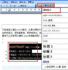 2、第二种方法是使用word自带的清除格式功能,选中需要清除格式的文字,然后如图选中样式下拉框中的清除格式文字,就可以将这段文字的格式去除了。