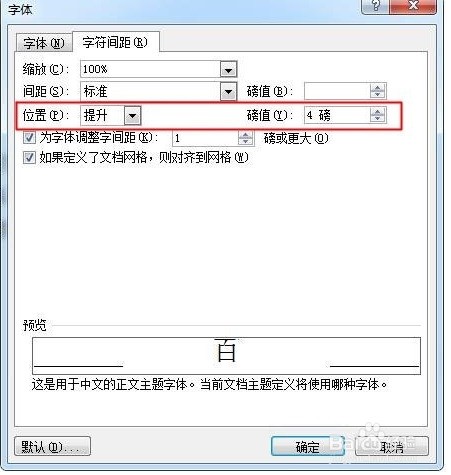 单击位置右下拉按钮,选择提升选项,并在调整提升的磅值。(根据实际情况调整字体提升的磅值)