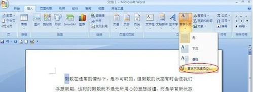 在【首字下沉】下拉栏中点击【首字下沉选项】,如图所示: