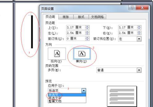 步骤六:注意当第二页设置页面陈握的时候,如果在第二页选中一行文字,然后在“预览”项中选择“所选文字”(如图6)此时,第三页系统默认为纵向;如果选中一行文字,然后在“预览”项中选择“所选节”(如图7),此时第三页系统默认为横向。