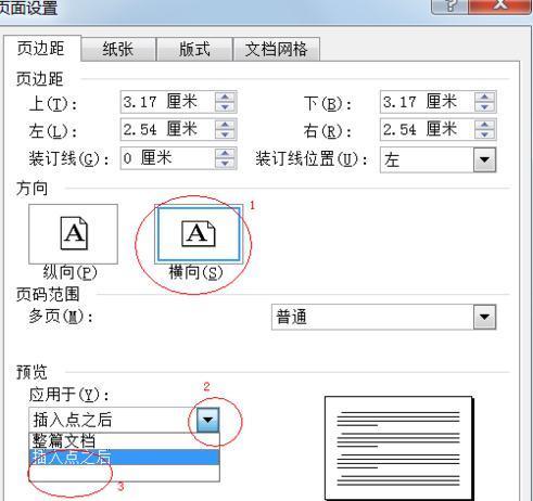 步骤三:在弹出的对话框中,在“方向”上选择“横向”(或按Alt+S组合键),点击“预览”项后面向下箭头(或按Alt+Y组合键),下拉菜单中选择“插入点之后”(如望永附优处建影信含图3),然后点击确定。